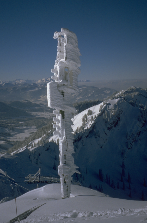 Windmessstationen sind meistens auf Gipfeln oder Graten. Dort kann die vom Gelände unbeeinflusste Hauptwindrichtung und -stärke gemessen werden. Auf dem Foto links ist die Windstation auf dem Vorgipfel des Brecherspitz zu sehen.